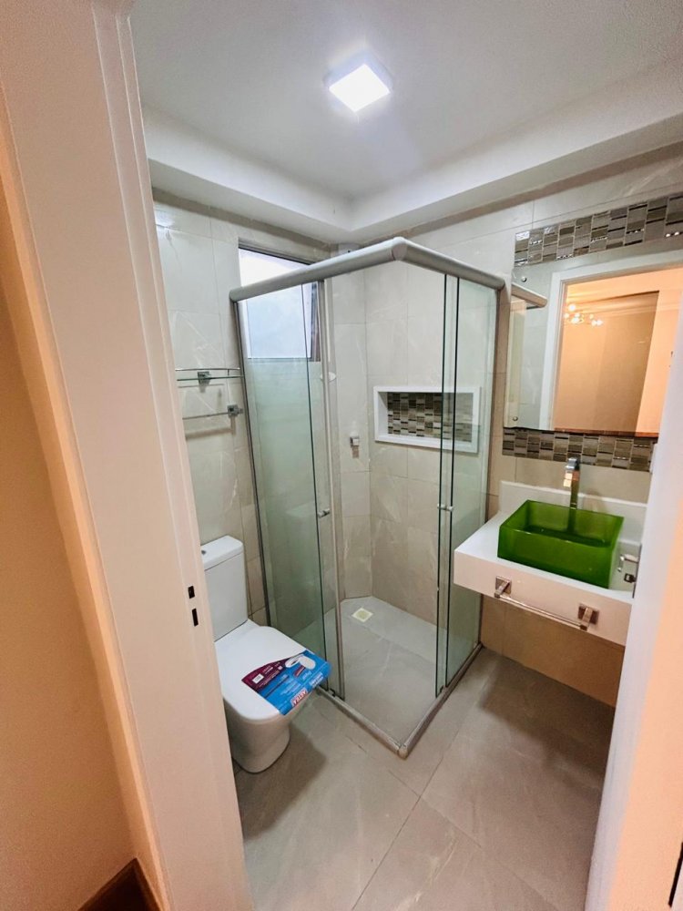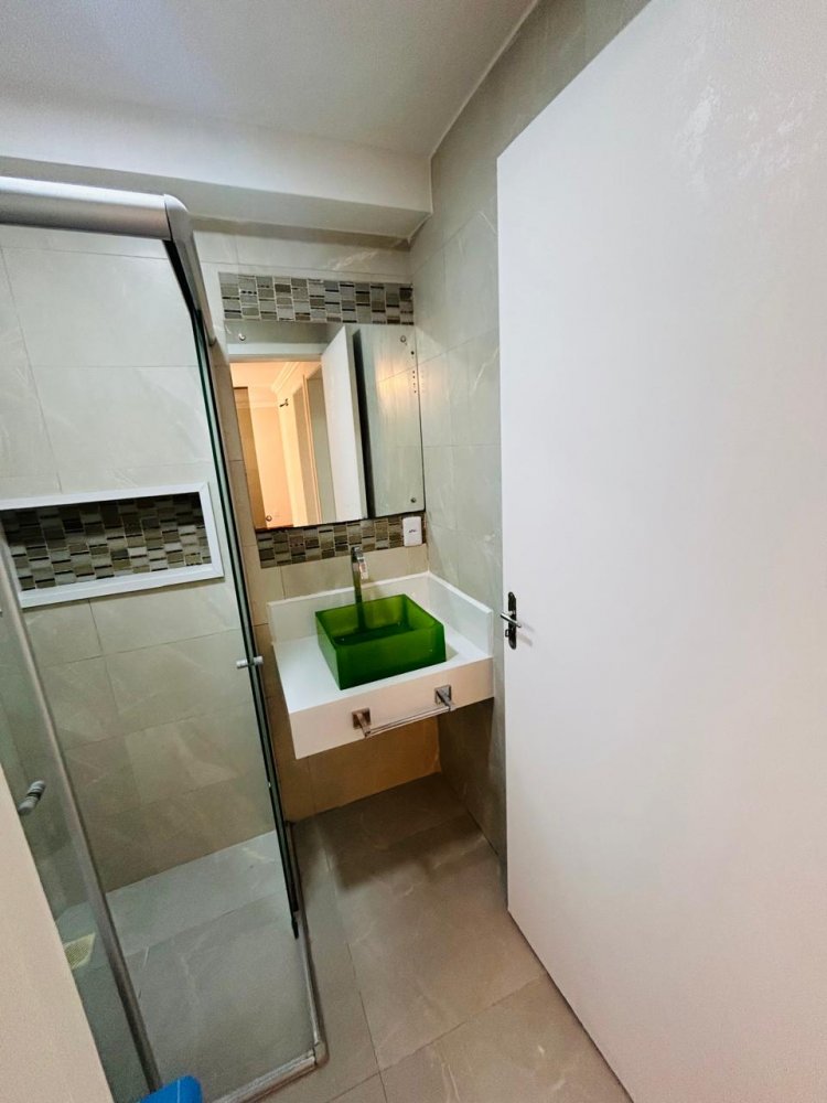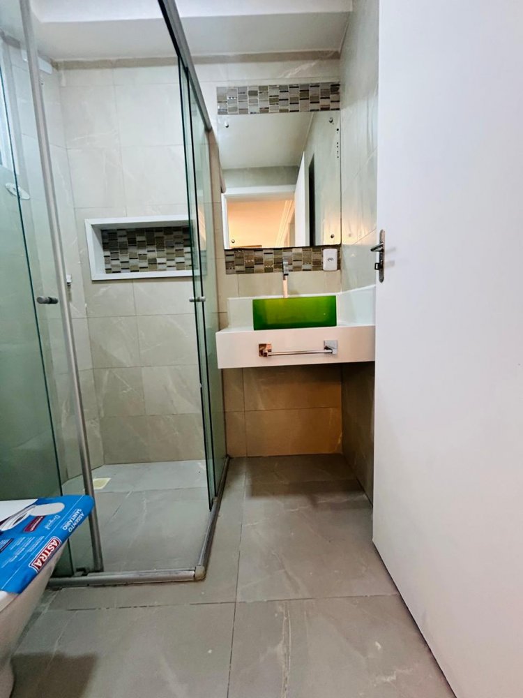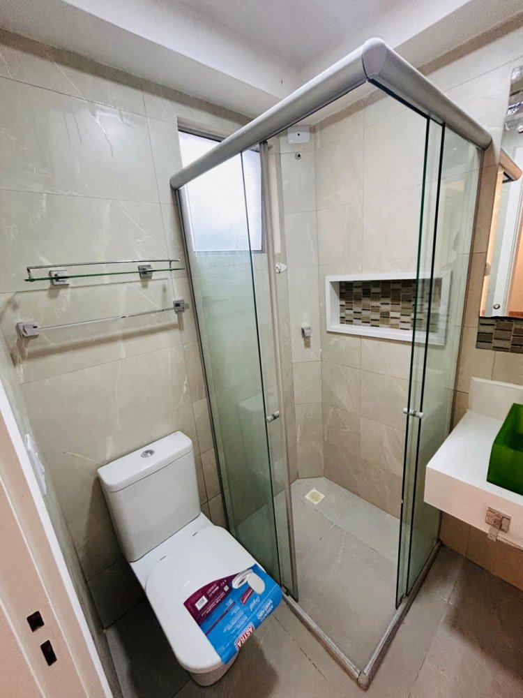 Banheiro com ótimo acabamento, bem distribuído e com espaço para armário e box.