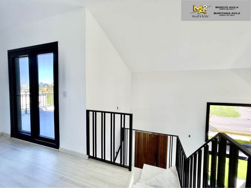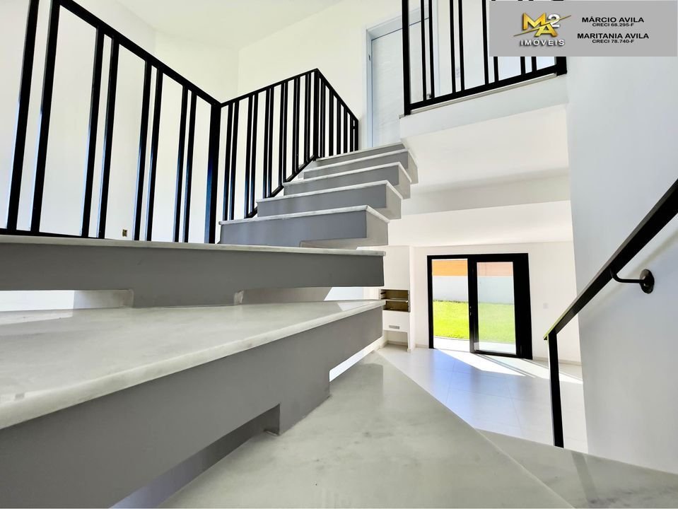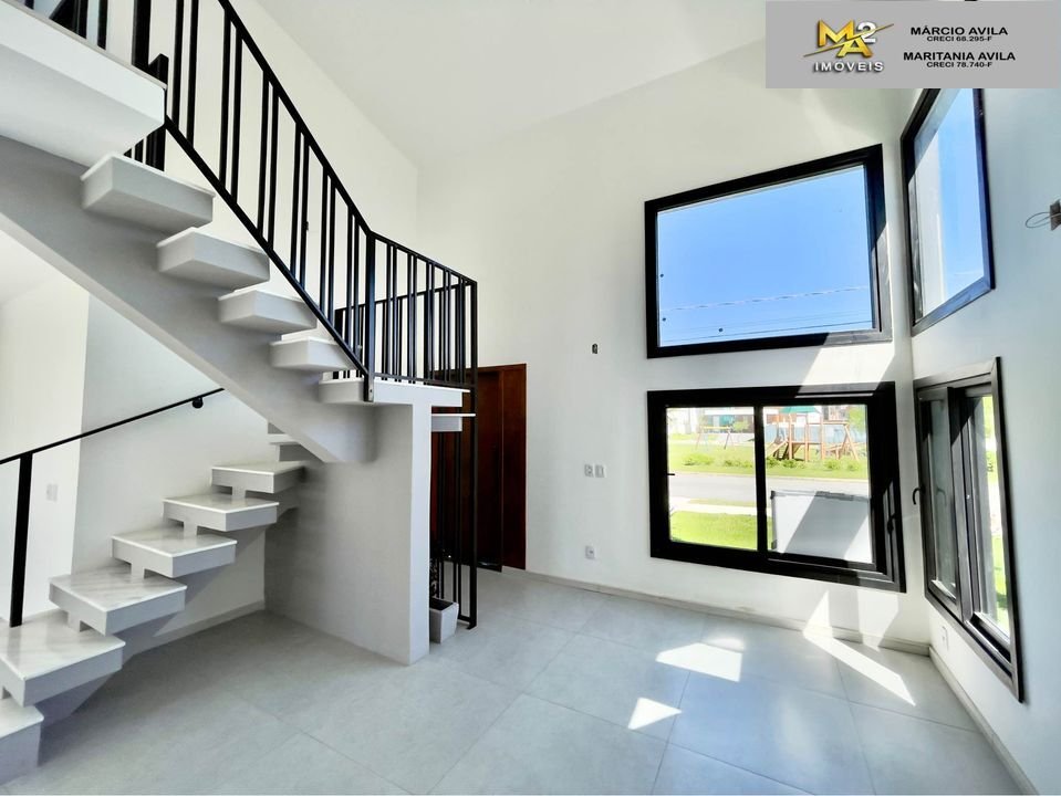 Dispõe de ótima localização no condomínio e uma posição solar privilegiada. Entrega uma sala de estar com pé direito duplo, cozinha com churrasqueira interna e acesso ao pátio, 01 dormitório térreo e 02 suítes na parte superior.